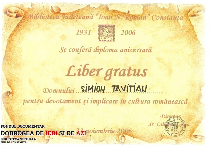 Diploma Liber gratus - Biblioteca Județeană Ioan N. Roman Constanța, 23.11.2006