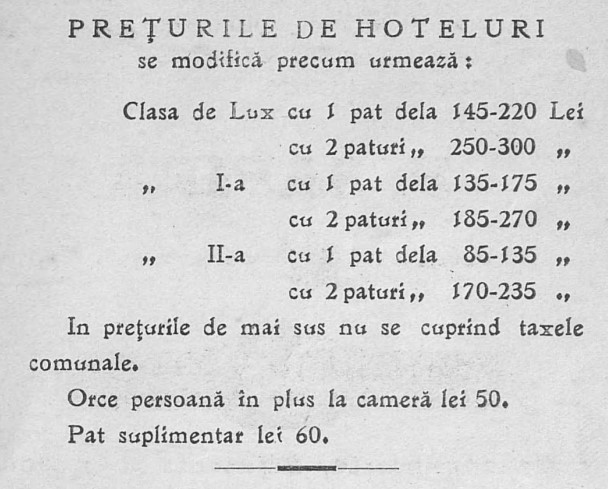 Prețurile camerelor particulare variază după poziție și după cum sunt cu 1 sau cu 2 paturi de la 1.000 la 4.000 lei lunar”.
