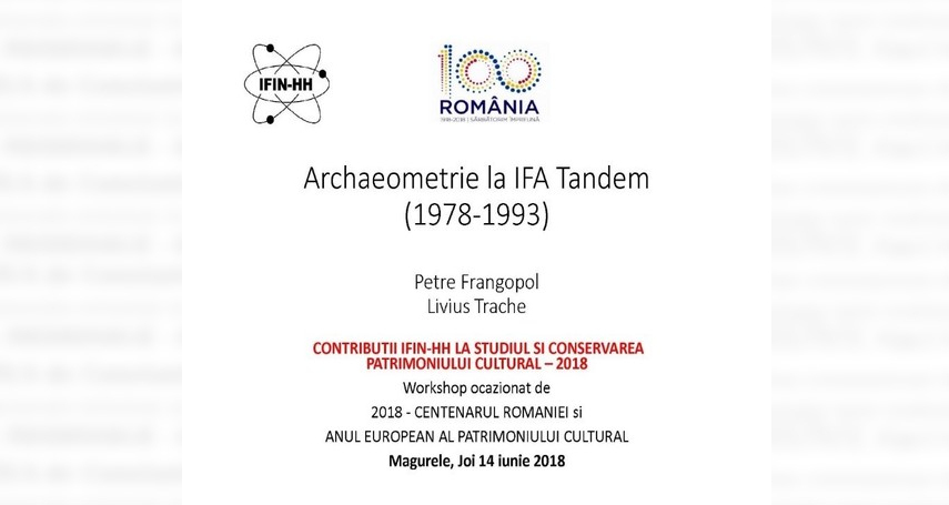 Imaginea reprezintă titlul unui workshop recent desfăşurat în Institut, referitor la ultimele rezultate din IFIN în domeniul studiului şi conservării patrimoniului cultural material, mobil sau imobil. A fost o manifestare internă cu invitaţi din afară, care a constituit o modestă contribuţie la sărbătorirea Centenarului României întregite şi la Anul European al Patrimoniului - 2018. Cu acea ocazie, împreună cu dl profesor, am făcut o istorie a rezultatelor noastre în arheometrie din cei 25 de ani de activitate, de care mă voi folosi în mare parte şi astăzi în prezentarea mea.