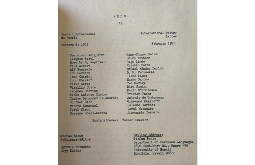Spre orgoliul nostru, al tuturor, şi al literaturii române în special, se cuvine să semnalez că această poezie a lui Blaga e publicată simultan în MELE în cinci versiuni: română, engleză, germană, japoneză şi... hawaiană. Pe copertă revista avea reprodusă o gravură a liceului, iar în interior era imprimată o frumoasă emblemă confecţionată ad-hoc în Hawaii, cu inscripţia «Liceul Andrei Şaguna, 1850-1975».