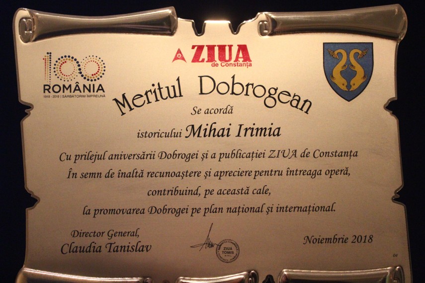 La 140 de ani de la reintegrarea Dobrogei la România, cotidianul ZIUA de Constanța a organizat evenimentul „Etniile împreună pentru Dobrogea”, prilej cu care a reluat ceremonia de acordare a 10 distincții „Meritul Dobrogean“, însoțite de medalia „Colonel Marin Ionescu Dobrogianu”.