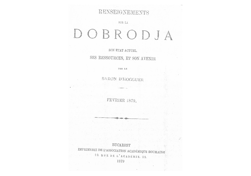 Ar putea fi prima minimonografie a Dobrogei scrisă de un străin. Cu afaceri de serviciu, cum își motiva călătoriile prin Dobrogea, baronul D’ Hogguer publica în februarie anul 1879, o broșură bine documentată intitulată „Renseigments sur la Dobroudja, son état actuel, ses ressources et son avenir.“(Informațiuni asupra Dobrogei, statutul actual, resursele și viitorul ei). Presa nu rămâne indiferentă și o recenzează favorabil. De la mare distanță, „Gazeta Transilvaniei” din Brașov scria: „Dobrogea, care până mai ieri făcea parte din Imperiul Otoman, e o provincie despre a cărei stare sanitară și economică am avut foarte puține date precise. Deși situată la Marea Neagră, și putând prin urmare să aibă un viitor prosper, mai nimeni nu ne-a dat relații detaliate de situația ei, de sorgintele ei de avuție, de populația ei. Numai când a început a se vorbi de alipirea Dobrogei la România și după ce s-a săvârșit acel act important, această provincie a atras atenţiunea tuturor oamenilor de stat ca și a particularilor în genere. Mai multe studii au apărut de atunci în scopul de a face cunoscut acest mic teritoriu românesc uzând de date statistice adunate la faţa locului cât s-a putut de exacte. Unele din aceste studii, și cel mai important, se datorește d-lui baron D’Hogguer publicat zilele trecute într-o broșură în limba franceză.— Notițele ce ne dă d. D’Hogguer despre starea Dobrogei judecată din toate privirile, fiind foarte interesante pentru comerțul român în genere și cu deosebire pentru acei, care ar voi să colonizeze această provincia cu coloni străini, vom spicui și noi dintr-însele datele cele mai importante ce ne relevă: Starea sanitară. S-a considerat în general, că Dobrogea este o provincie cu totul insalubră și pernicioasă sănătății. Acestă credință este exagerată. Județele cele mai mult bântuite de friguri, care de altmintelea nu sunt pernicioase, sunt cele de pe marginea Dunării începând de la Isaccea, până la Dăeni și de la Tulcea până la Silistra. Acestea provin din miasmele evaporate de noroaiele ce rămân după retragerea apelor Dunării revărsate, și din nenumărate canaluri artificiale, construite de pescari pentru pescuit. /…/ Medjidie, spre exemplu, e un oraș construit în mare parte la picioarele unei coline și cealaltă pe marginea unei bălți pestilențiale foarte întinse. La începutul toamnei, această baltă seacă și formează o imensă câmpie de nămol negru, puturos, unde se descompun la căldura soarelui materii organice, pești, raci, scoici etc. și materii vegetale, din care se degajează miasme paludiane. Toate casele sunt construite în pământ umed, în care adesea locuiește toată familia, cu 3—4 câini, porci, găini etc. — Temperatura e variabilă în Dobrogea, deși iernile nu sunt de obicei friguroase. Primăvara și toamna sunt scurte. E de notat însă, că, de 30 ani n-au fost aci friguri tifoide. /.../In Dobrogea sunt 7 lacuri sărate care nu pot fi toate transformate în saline. Numai unul a fost exploatat însă într-un mod primitiv. Cariere. În Dobrogea sunt mai multe cariere de piatră și de var în lungul Dunării, de la Sulina până la Cernavoda; cele mai interesante sunt cele de la Tulcea și Măcin. Se face un mare export de pietre de construcție și de pavage din carierele de la Măcin, Iglița și Isaccea pentru Brăila și Galați.”[1]