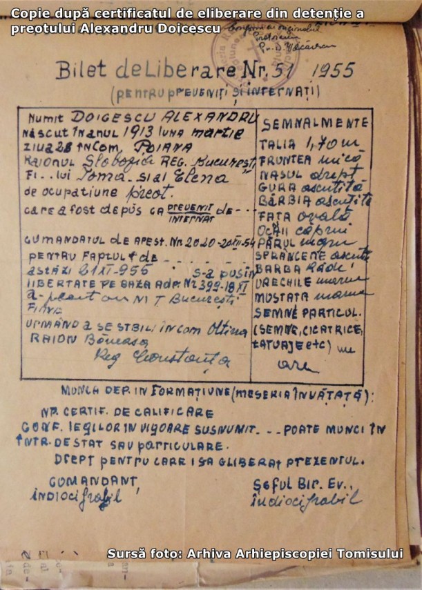 Părintele Alexandru Doicescu a fost eliberat pe 21 noiembrie 1955, fără să fie judecat sau condamnat, după cum mărturiseşte într-o adresă către episcopie: