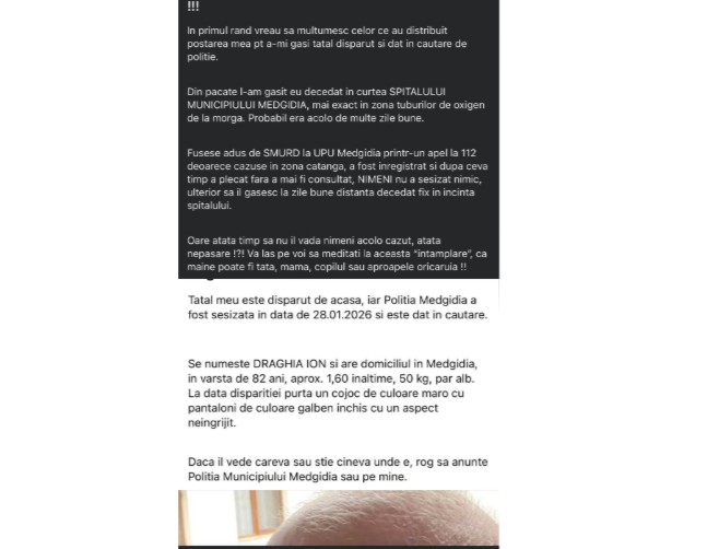 Conform informațiilor furnizate de fiu, bărbatul fusese transportat anterior la Unitatea de Primiri Urgențe Medgidia cu o ambulanță SMURD, în urma unui apel la 112. Deși a fost înregistrat, pacientul ar fi părăsit unitatea înainte de a fi consultat de medici, fără ca personalul spitalului să semnaleze dispariția acestuia.