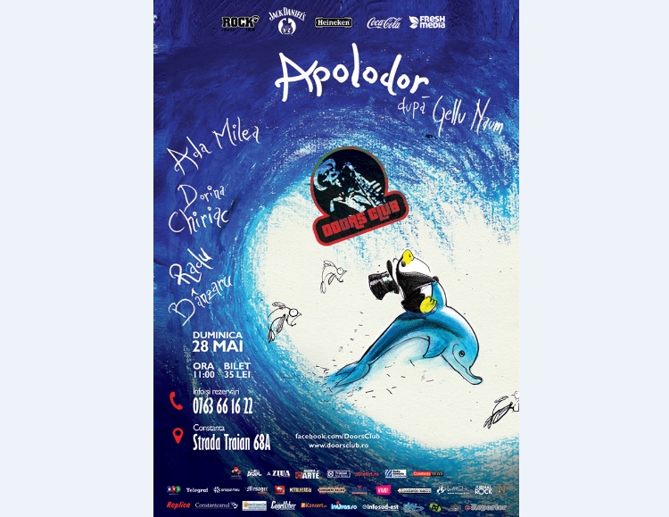 Duminică, 28 mai, de la ora 11.00, Doors Club din Constanţa găzduieşte spectacolul „Apolodor”, după „Cartea lui Apolodor” de Gellu Naum, cu Dorina Chiriac, Radu Bânzaru și Ada Milea - un concert cu personaje, o „hartă muzicală” a călătoriilor pinguinului Apolodor pe glob.Prețul unui bilet este 35 de lei. Biletele se vor pune la vânzare luni, 22 mai.