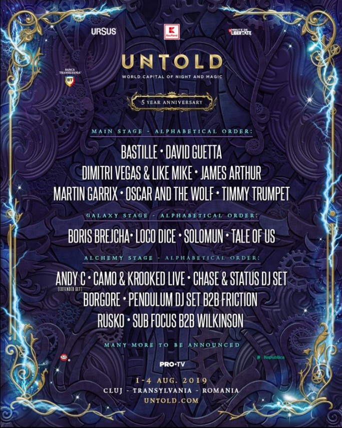Potrivit reprezentanților UNTOLD, primii artiști anuntați în line-up-ul festivalului sunt: Martin Garrix, David Guetta, Dimitri Vegas&Like Mike, Timmy Trumpet, Bastille, James Arthur, Oscar and The Wolf, Loco Dice, Solomun, Andy C, Borgore, Chase&Status, Boris Brejcha, Rusko, Tale of US și Sub Focus B2B Wilkinson, Pendulum DJ Set B2B Friction, Camo&Krooked Live. Acestea sunt doar primele nume dintr-un line-up care se anunță a fi unul legendar la ediție aniversară.