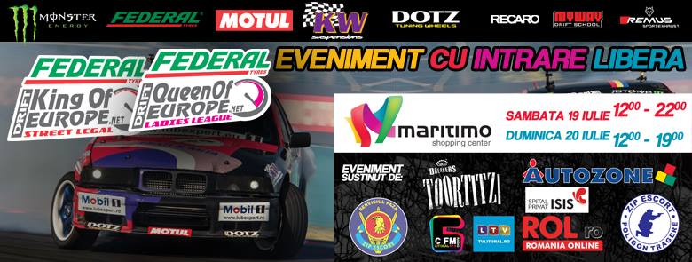 La Maritimo Shopping Center, pe 19 şi 20 iulie, va avea loc Campionatul European de Drift, prin cele două divizii, şi anume King of Europe Street Legal şi Queen of Europe, când vor participa cei mai talentaţi concurenţi din Europa, care speră că vor obţine victoria în faţa celor mai cunoscuţi piloţi de drift din România. Evenimentul se va desfăşura sâmbătă între orele 12.00 şi 22.00, în timp ce duminică va fi ziua principală a competiţiei, când participanţii vor ieşi în tandem pe traseu, programul urmând să aibă loc între orele 12.00 şi 19.00.Campionatul European de Drift King of Europe a avut parte de o creştere explozivă în ultimii ani, în prezent, fiind urmărit de peste 85 de milioane de oameni la nivel global, prin intermediul posturilor TV partenere. Numărul tot mai mare de piloţi şi cererea pentru evenimente marca King of Europe a dus la crearea unor divizii speciale în cadrul campionatului, pentru a facilita condiţii egale pentru concurenţi, precum şi o acoperire din ce în ce mai mare la nivel continental.