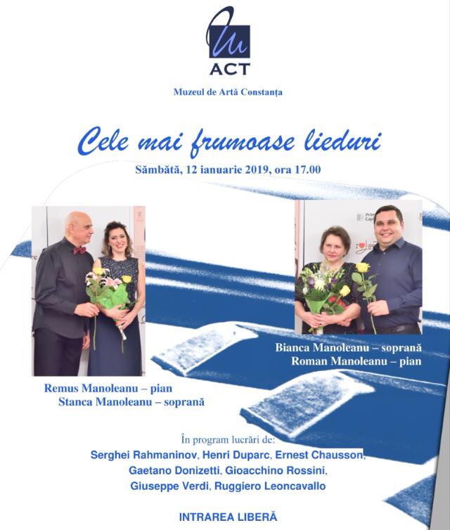 Evenimentul intitulat „Cele mai frumoase lieduri” începe la ora 17:00 și îi are ca protagoniști pe sopranele Bianca Luigia Manoleanu și Stanca Maria Manoleanu, care vor fi acompaniate la pian de Roman Manoleanu și Remus Manoleanu.