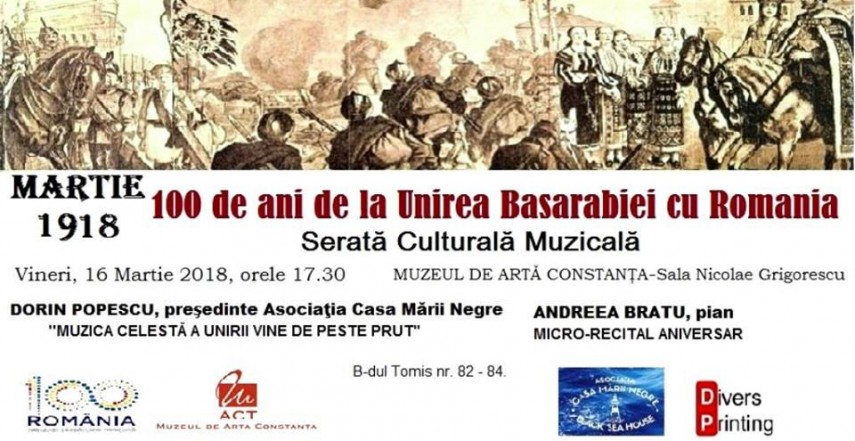 Asociația Casa Mării Negre / Black Sea House din Constanța celebrează, împreună cu prietenii și partenerii acesteia, Centenarul Unirii Basarabiei cu România, printr-o Serată Cultural-Muzicală care va avea loc la Muzeul de Artă Constanța (sala Nicolae Grigorescu), vineri, 16 martie 2018, ora 17.30, cu titlul 100 de ani de la Unirea Basarabiei cu România. Evenimentul va fi deschis printr-o mini-conferință cu tema Muzica celestă a Unirii vine de peste Prut – conferențiază dr. Dorin Popescu, fost consul general ad interim al României la Cernăuți. Programul continuă cu un microrecital aniversar susținut la pian de către Andreea Bratu, lector universitar doctor al Facultății de Arte, Universitatea Ovidius din Constanța (din program: Serghei Rachmaninov, Vladimir N. Drozdoff, Al. N. Scriabin, George Enescu, Ciprian Porumbescu, Marțian Negrea, Tiberiu Brediceanu, Filip Lazăr, Paul Constantinescu).
