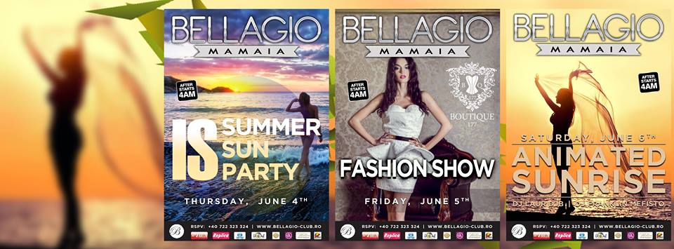 Bellagio Club Mamaia continuă şi în acest wekeend să organizeze petreceri dedicate constănţenilor, dar şi turiştilor. Prin urmare, joi, 4 iunie, începând cu ora 23.00, la Bellagio se dă startul petrecerii „Is Summer Sun Party”, în timp ce vineri, 5 iunie, va avea loc o prezentare de modă cu cea mai exclusivistă casă de modă din Constanţa: Boutique 177: „Bellagio şi Boutique 177 au încheiat un parteneriat pe toată perioada verii, modelele putând fi văzute doar pe scena clubului Bellagio”, se precizează într-un comunicat.Distracţia continuă şi sâmbătă seară în Bellagio, când va avea loc petrecerea „Animated Sunrise”. Începând cu ora 4.00 AM, se dă startul la After Party, care va ţine până la ultimul client. Rezervările se pot face la numărul de telefon 0722.323.324.