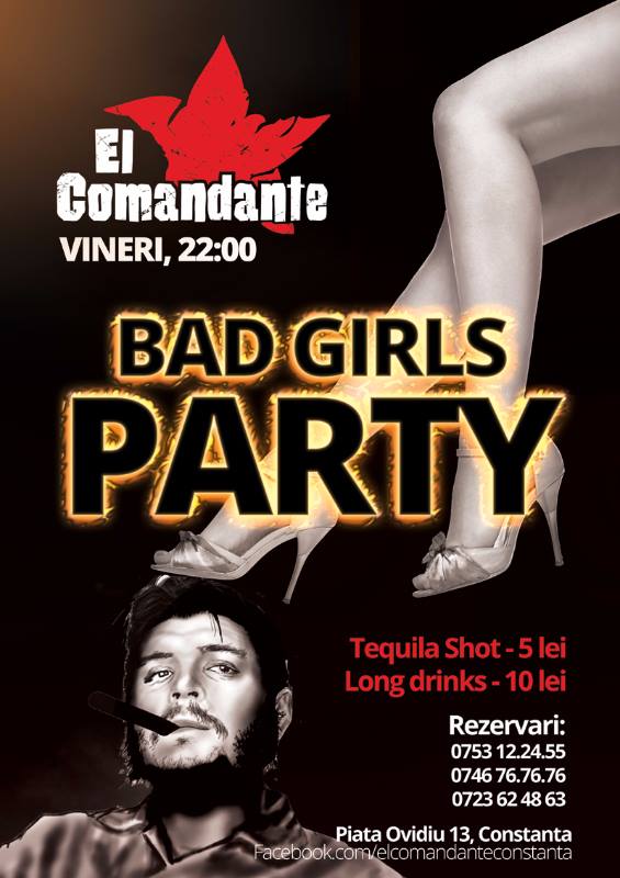 Mâine seară, El Comandante din Constanţa organizează o nouă ediţie a petrecerii „Bad Girls”. „Fetele bune se duc în rai... fetele rele se duc unde vor ele”, scriu, cu umor, organizatorii pe pagina oficială de Facebook a evenimentului. Distracţia începe de la ora 21.00.Sâmbătă, de la aceeaşi oră, El Comandante propune petrecerea „Party Para la Resistencia", iar duminică, tot de la ora 21.00, o petrecere retro.