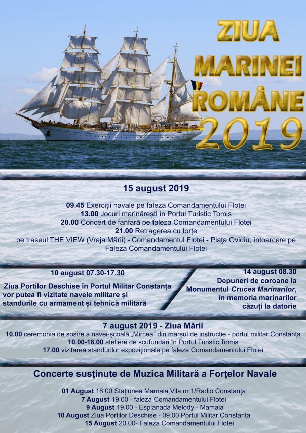 Festivitățile dedicate Zilei Marinei Române debutează joi, 15 august, de la ora 09:45, cu exercițiile navale care se vor desfășura pe faleza Comandamentului Flotei. De la ora 13:00, publicul poate participa la jocurile marinărești organizate în Portul Turistic Tomis.