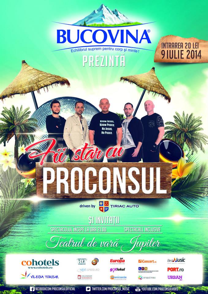 La Teatrul de Vară Jupiter, seara de 9 iulie, începând cu ora 21.00, este rezervată formaţiei Proconsul, care va susţine un concert. Totodată, membrii trupei Pronconsul vin la Jupiter cu un nou concept de show, „Fii star cu Proconsul!”, un concept inedit de karaoke live.Trupa Proconsul, formată din Bodo (voce), Dragoş (chitară), Robert (keyboards), Vali (tobe), Robert (bas) şi Sorin (keyboards şi programming), va încânta publicul cu hit-urile lor, printre care se numără „Cerul”, „Mi-ai luat inima”, „Fata pentru care cânt”,„Aşa trec anii”, cel mai nou single. De asemenea, Proconsul va cânta până pe trei septembrie, în fiecare miercuri, la Teatrul de Vară Jupiter. Preţul unui bilet este de 20 de lei.