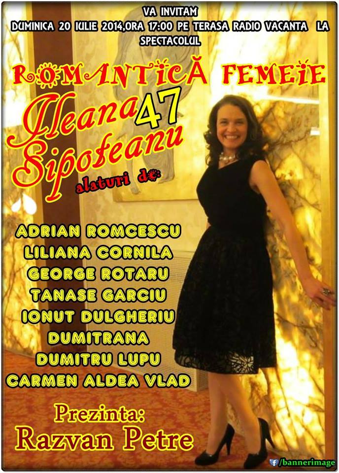 Astăzi, de la ora 17.00, cunoscuta interpretă Ileana Şipoteanu va susţine un spectacol în staţiunea Mamaia, pe terasa Radio-Vacanţa, în cadrul evenimentului „Romantică femeie”. Totodată, vor mai fi prezenţi Adrian Romcescu, Liliana Cornilă, George Rotaru, Tănase Gaciu, Ionuţ Dulgheriu, Dumitrana, Camen Aldea Vlad şi Dumitru Lupu. Evenimentul va fi prezentat de Răzvan Petre.În decursul carierei, Ileana Şipoteanu a fost distinsă cu numeroase premii. Dintre melodiile artistei amintim „Ce mult te-am iubit”, „Cine mi-a luat iubirea”, „Îmi cântă marea”, „Eşti iubirea vieţii mele”.