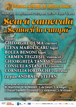 La Teatrul Naţional de Operă şi Balet „Oleg Danovski” din Constanţa va avea loc, miercuri, 28 mai, de la ora 19:00, o „Seară Camerală”. Pe scena lirică de la Constanţa vor urca soliştii Cristina Vârtejan (oboi), Dumitru Porcescu (vioară) şi Natalia Gribinic (pian).