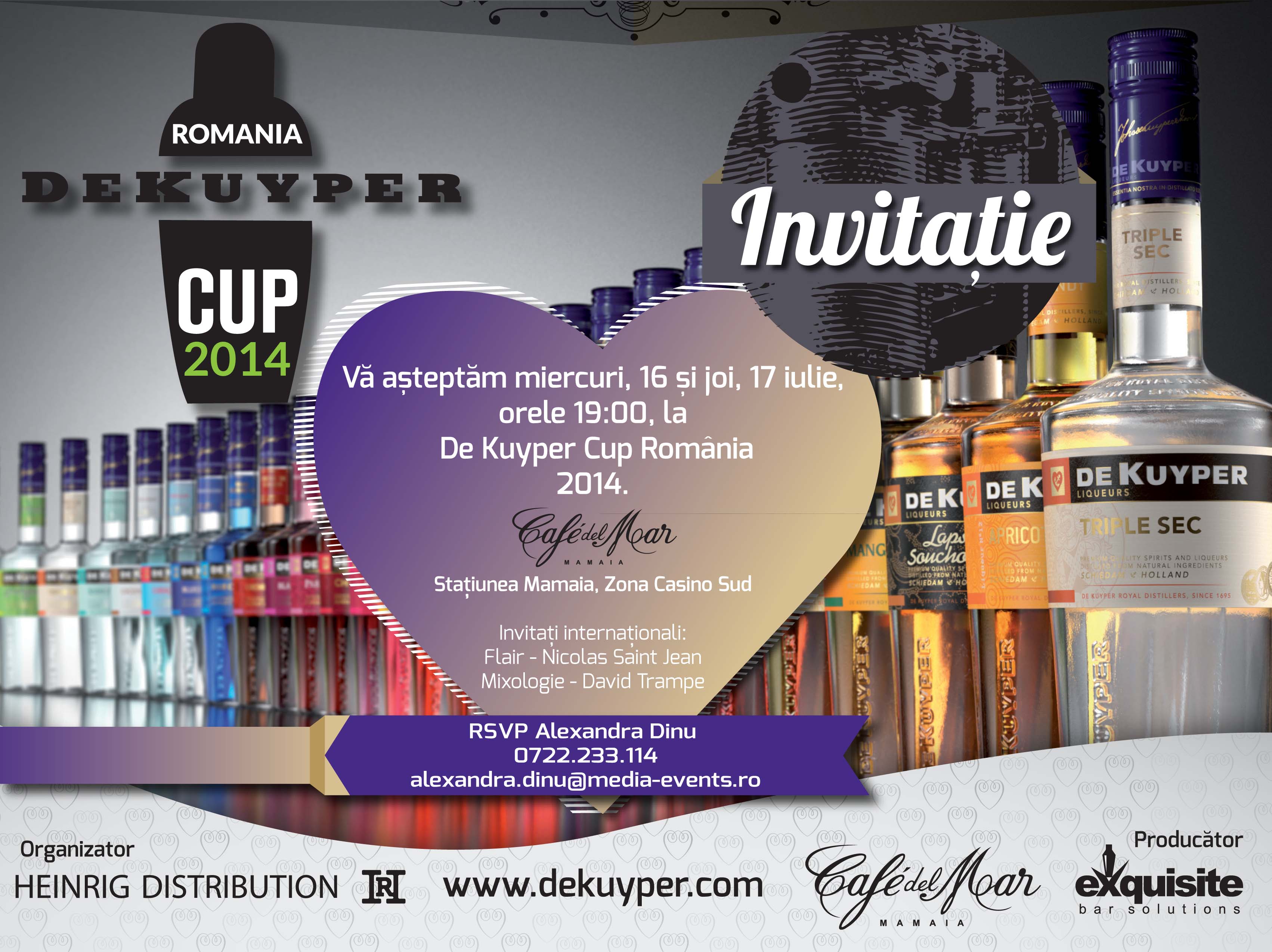 Pe 16 şi 17 iulie, începând cu ora 19.00, la Café del Mar din staţiunea Mamaia, zona Casino Sud, va avea loc finala concursului naţional de bartending De Kuyper Cup România 2014. În urma evenimentului, vor fi desemnaţi cei mai buni barmani din ţară.Concursul, realizat din anul 2005 de Heinrig Distribution, distribuitorul mărcii De Kuyper în România, şi produs de agenţia de barmani profesionişti Exquisite Bar Solutions, este destinat barmanilor profesionişti. De Kuyper Cup România este organizat o dată la doi ani pentru alegerea celui mai bun barman preparator şi a celui mai bun barman de show. Astfel, competiţia cuprinde două categorii specifice industriei, şi anume „Mixology”, arta amestecării băuturilor, şi „Flair”, arta bartending-ului spectacol, ce implică tehnici şi mişcări speciale în manipularea instrumentele de bar şi a sticlelor de băuturi.