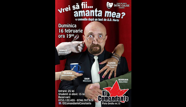 Trupa de teatru „Între Culise” invită publicul constănţean la spectacolul „Vrei să fii...amanta mea?”.Piesa este programată pentru data de 16 februarie, de la ora 19.00, la El Comandante Constanţa.