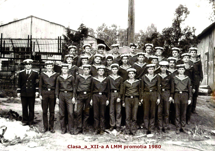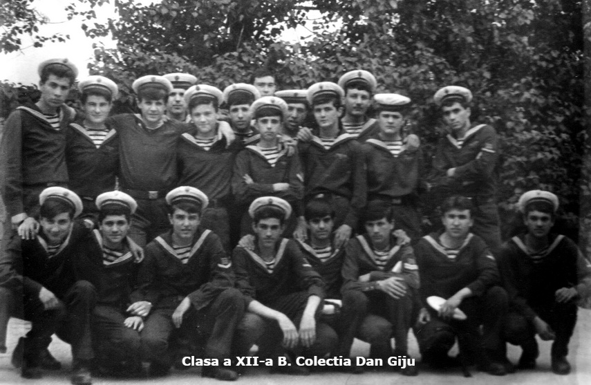 În fotografie: Elevii clasei a XII-a B, Navigaţie, a Liceului Militar de Marină „Alexandru Ioan Cuza”, Constanţa, prin octombrie 1981, la începutul anului III de studii, cei cu gradul doar de fruntaş având media sub 8 la învăţătură, altminteri, gradul corespondent anului respectiv era acela de caporal). De la stânga, rândul de jos: Eugen Poenaru (Hunedoara), Roland Cardel (Timişoara), Vasile Nicolae (Craiova), Valentin Coveanu (Turnu Măgurele), Ionel Radu (Constanţa), Constantin Savu (Mangalia), Ioan Mariei (Crăcăoani, Neamţ), Vasile Axinte (Iaşi); Sus, de la stânga: Toni Axini (Năvodari), Laurenţiu Barticel (Roman, Bacău), Radu Adam (Dumbrăveni, Suceava), Ioan Munteanu (în spatele lui Adam, Rm. Vâlcea), Dumitru Gafiţa (dintr-o comună suceveană), Victor Belciuganu (Adjud), Adrian Vâlcu (Mangalia), Ovidiu Cănea (în spatele lui Vâlcu, Năvodari), Victor Stoica (Constanţa), Victor Gâdiuţă (Măcin, Tulcea), Florin Chelu (Spicu, Brăila), Gheorghe Adamache (Tulcea) şi Dan Gîju (Dideşti, Teleorman). (Fotografie din colecţia lui Dan Gîju).