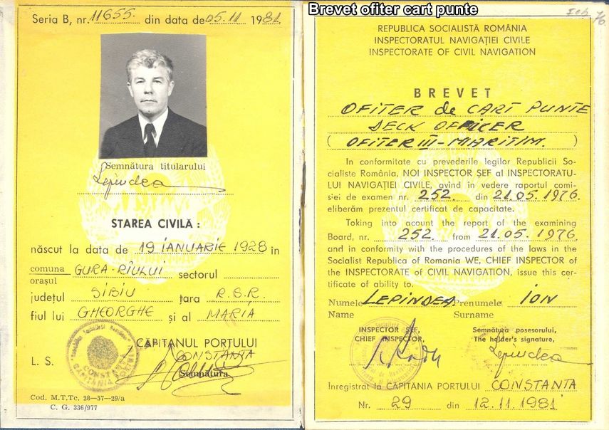 Doresc ambarcarea în vederea perfecţionării pe mare a brevetelor obţinute succesiv în anii 1950, 1952, 1954 şi 1976 şi, nu în ultimul rând, al practicii în funcţiile superioare în cadrul serviciilor de exploatare comercială. Convins că cererea va obţine un răspuns favoral, Mulţumesc respectuos”.