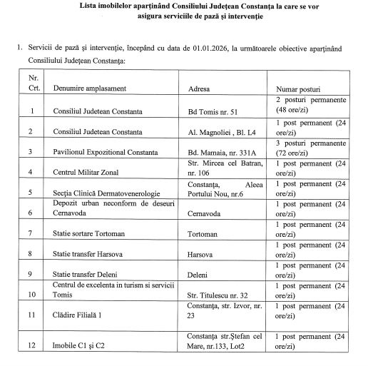 Prin adresa Direcţiei de Pază a Judeţului Constanța nr. 3242/04.12.2025, înregistrată la Consiliul Judeţean Constanța sub nr. 43931/04.12.2025, Direcția de Pază a Județului Constanţa comunică faptul că are agenți de securitate disponibili în vederea prestării serviciilor de pază, monitorizare şi intervenție la obiectivele aparținând Consiliului Judeţean Constanţa pentru anul 2026, precum şi tarifele la care poate presta serviciile de pază, monitorizare şi intervenţie, cu precizarea că tariful estimativ pentru anul 2026 poate fi actualizat în funcție de modificările legislative privind salarizarea personalului plătit din fonduri publice.
