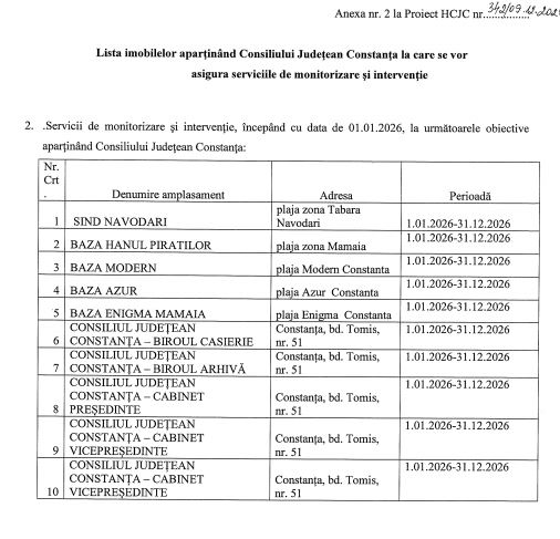 Consiliul Județean Constanța a fost convocat în ședință ordinară luni, 15 decembrie 2025, de la ora 10:00, în sala „Remus Opreanu” a Palatului Administrativ. Convocarea a fost făcută prin Dispoziția nr. 863/09.12.2025, emisă de președintele CJ Constanța, Florin Mitroi.Printre proiectele de pe ordinea de zi se află și Proiect de hotărâre nr.342/09.12.2025 privind asigurarea serviciilor de pază, monitorizare și intervenție pe anul 2026 pentru obiectivele aparținând Consiliului Județean Constanța de către Direcția de Pază a Județului Constanța.
