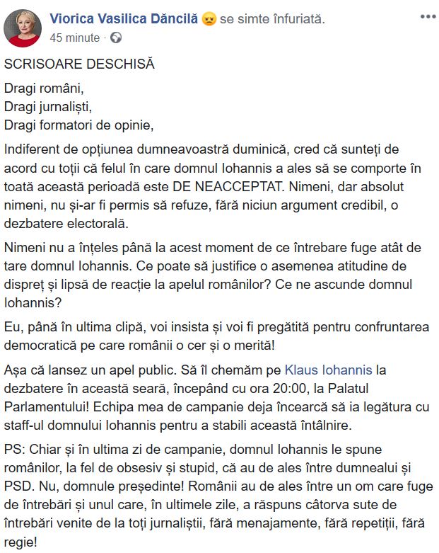 Să îl chemăm pe Klaus Iohannis la dezbatere în această seară, începând cu ora 20,00, la Palatul Parlamentului! Echipa mea de campanie deja încearcă să ia legătura cu stafful domnului Iohannis pentru a stabili această întâlnire", a postat pe Facebook Viorica Dăncilă.