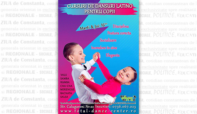 Ai un copil energic şi dornic de mişcare? Îi poţi canaliza energia spre salsa, merengue sau bachata!O postură corectă şi sănătoasă, eleganţă şi rafinament în mişcare, încredere în sine, cunoaşterea unui număr variat de stiluri de dans precum salsa, rumba, cha cha, dar şi un mod sănătos de a petrece timpul liber sunt doar câteva dintre motivele pentru care merită să-ţi înscrii copilul la cursuri de dansuri latino. Aşadar, începând cu luna octombrie, în zilele de marţi şi de joi, de la ora 16.00, copiii pot da un nou sens distracţiei la Total Dance Center.