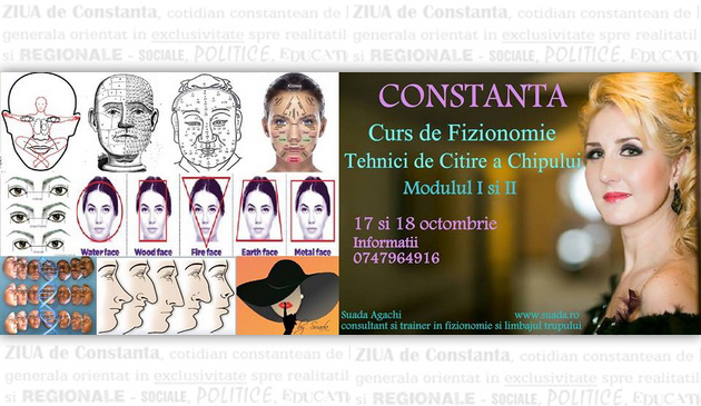 În luna octombrie, constănţenii pot participa la un curs de fizionomie, în cadrul căruia vor învăţa despre tehnici de citire a chipului. Cursul, programat în zilele de 17 şi 18 octombrie, în intervalul orar 12.00-20.00, va fi susţinut de Suada Agachi, consultant şi trainer în fizionomia şi limbajul trupului.Cursul este împărţit în două module, fiecare cu următoarele teme: