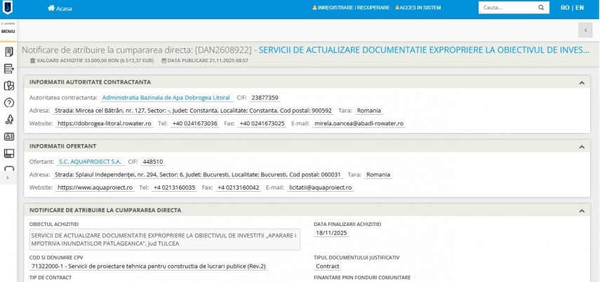 Administrația Bazinală de Apă Dobrogea Litoral a derulat recent două achiziții publice prin cumpărare directă, ambele atribuite companiei Aquaproiect SA, pentru proiecte de protecție împotriva inundațiilor în județul Tulcea și în localitatea Babadag.