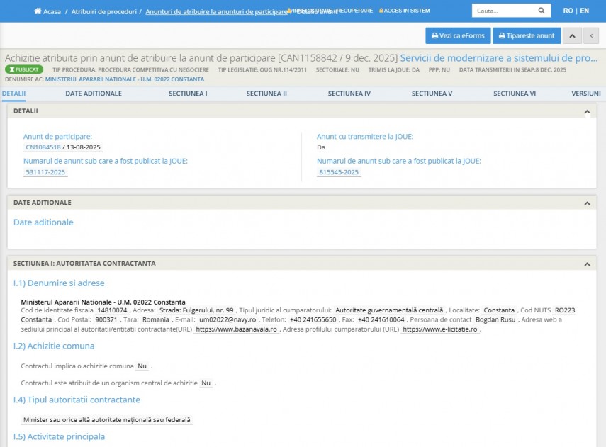 Ministerul Apărării Naționale, prin U.M. 02022 Constanța (Baza Logistică Navală) a atribuit recent un contract de servicii de modernizare a sistemului de propulsie pentru nava tip VEDETA BLINDATĂ GENERAȚIA A III-A, PROIECT MM262
