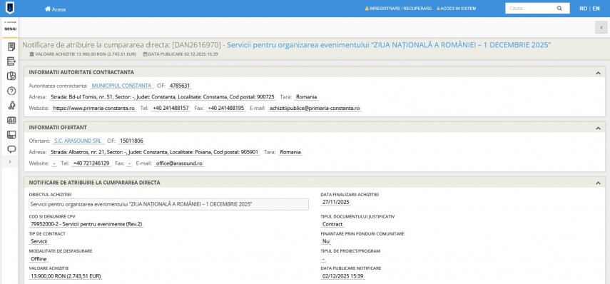 Primăria municipiului Constanța a atribuit serviciul de organizare a evenimentului „Ziua Națională a României – 1 decembrie 2025” firmei SC Arasound SRL.