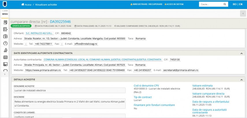 Contractul, în valoare de 248.836,65 lei, a fost atribuit firmei Instalco A.G. SRL. Potrivit anunțului publicat în Sistemul Electronic de Achiziții Publice (SEAP), sub numărul DA39225946, lucrările vizează rețeaua de alimentare cu energie electrică a unității de învățământ, în conformitate cu prevederile contractuale privind livrarea și plata serviciilor.