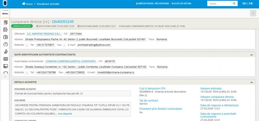 Primăria Cumpăna din județul Constanța a finalizat o achiziție directă pentru închirierea unui pachet de iluminat festiv dedicat Sărbătorilor Pascale.