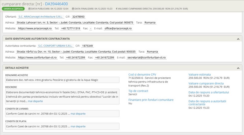 - SC Confort Urban SRL a atribuit recent prin cumpărare directă un contract de elaborare documentații tehnico-economice în fazele DALI, DTAA, PAC, PT+CS+DE și asistență tehnică din partea proiectantului inclusiv verificare tehnică pentru obiectivul „Lucrări de intervenții și modernizare: Bd-ul Mamaia, pe sectorul cuprins între sensul giratoriu Pescărie intersecție cu Aleea Studenților și sensul giratoriu de la Aqua Magic (telegondolă), Municipiul Constanța”.