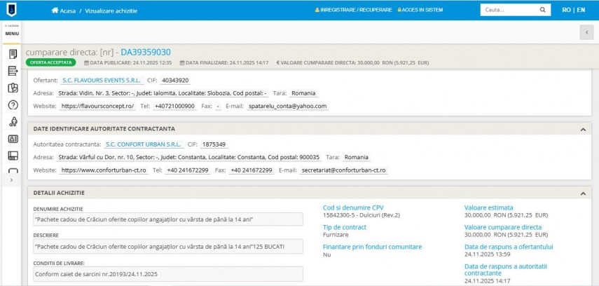 Confort Urban SRL a finalizat achiziția directă a pachetelor cadou de Crăciun destinate copiilor angajaților cu vârsta de până la 14 ani. Valoarea achiziției este de 30.000 lei, iar furnizorul selectat este compania Flavours Events SRL, cu sediul în Slobozia, județul Ialomița.