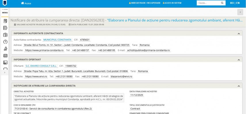 Primăria Municipiului Constanța a finalizat astăzi, 16 ianuarie 2026, procedura de achiziție pentru elaborarea unui document strategic esențial: Planul de acțiune pentru reducerea zgomotului ambiant. Contractul a fost atribuit prin cumpărare directă societății Enviro Consult SRL, o firmă specializată din București, pentru suma de 99.000 de lei.