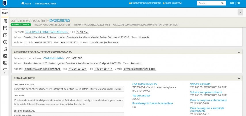 Anunțul a fost publicat în data de 22 decembrie 2025, având numărul DA39598765 în Sistemul Electronic de Achiziții Publice.