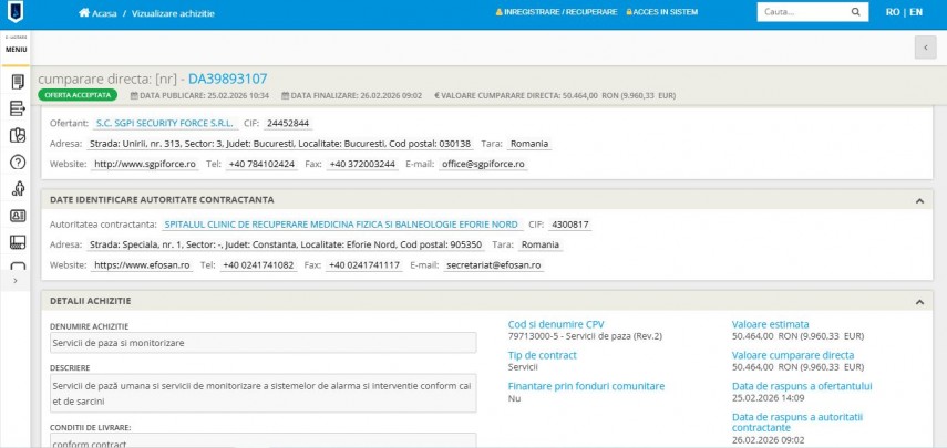Spitalul Clinic de Recuperare Medicină Fizică și Balneologie Eforie Nord a atribuit, în intervalul decembrie 2025 – februarie 2026, trei contracte prin cumpărare directă pentru servicii de pază și monitorizare către aceeași societate, SGPI Security Force SRL.