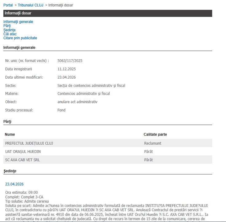 La 23.04.2026, magistrații au admis cererea formulată de reclamanta Instituția Prefectului Județului Cluj, în contradictoriu cu pârâții UAT ORAȘUL HUEDIN și SC AXA CAB VET SRL.