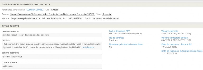 Potrivit anunțului din SEAP, contractul a fost atribuit în data de 11.12.2025 și este în valoare de 83.457 lei.