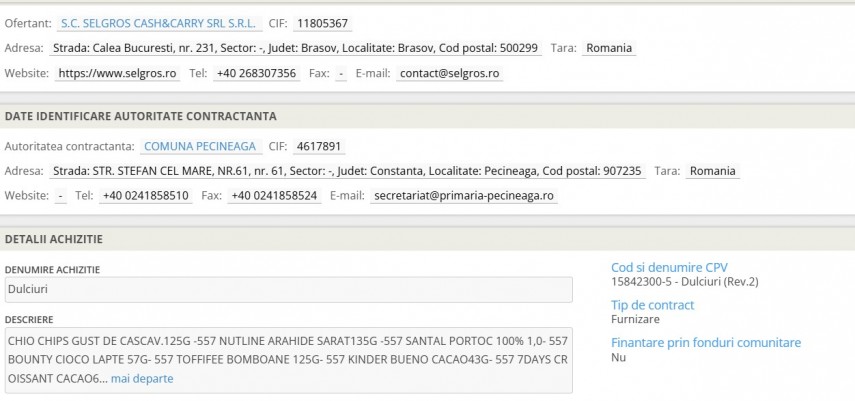 Cumpărări Constanța Primăria Pecineaga cumpără dulciuri în valoare de peste 45.000 de lei. Ce firmă le furnizează? (DOCUMENT)