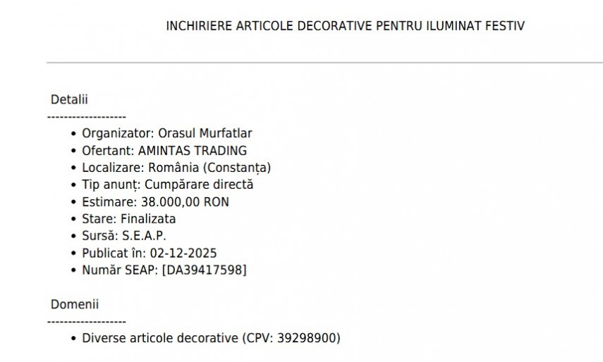 Primăria Murfatlar, județul Constanța, a atribuit un contract privind închirierea de articole decorative pentru iluminat festiv în perioada sărbătorilor de iarnă.