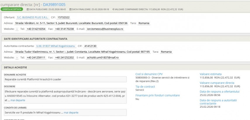 Cumpărări Constanța UM 01837 Mihail Kogălniceanu face reparații la o platformă autopropulsantă de încărcare - descărcare aeronave. Cu ce firmă a semnat contractul (DOCUMENT)