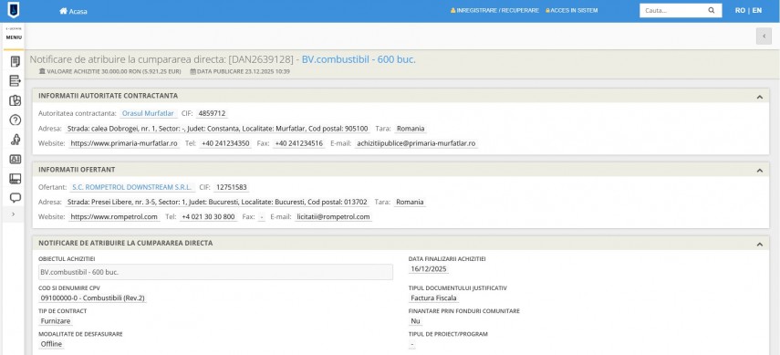Primăria Orașului Murfatlar a realizat, în perioada 2020–2025, sute de achiziții directe pentru combustibil, toate atribuite aceluiași furnizor: SC Rompetrol Downstream SRL, potrivit datelor publice din platforma de achiziții.