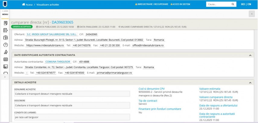 Prima achiziție, publicată în 23 decembrie 2025, sub numărul DA39603729, are ca obiect servicii de sortare, tratare mecano-biologică și depozitare a deșeurilor menajere, fiind încadrată la codul CPV 90510000 – Eliminare și tratare a deșeurilor menajere. Valoarea estimată a contractului este de 101.884,65 lei, iar procedura este finalizată.