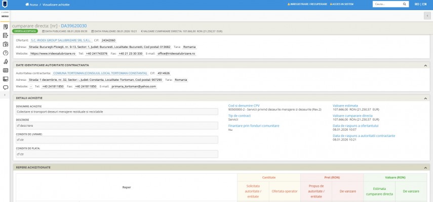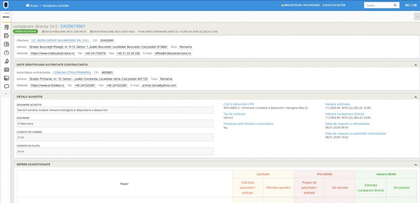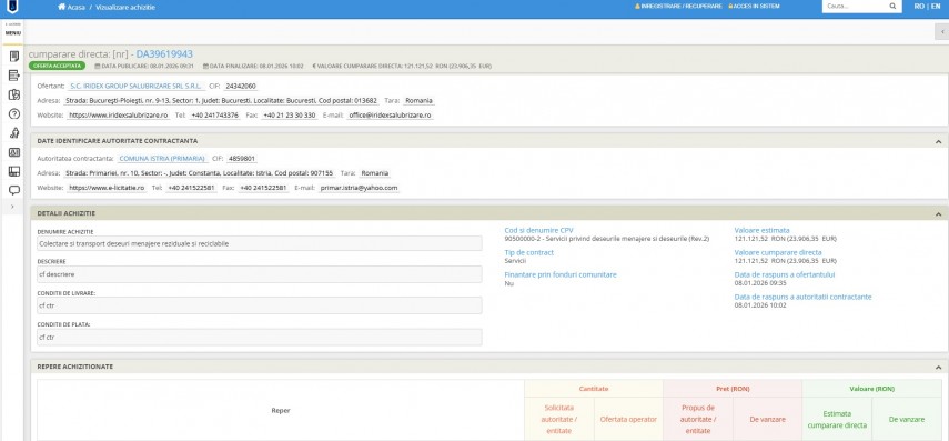 Nu în ultimul rând, Primăria Comunei Istria, județul Constanța a atribuit prin cumpărare directă un contract de colectare și transport deșeuri menajere reziduale și reciclabile. Contractul atribuit societății Iridex Group Salubrizare SRL este în valoare de 121.121,52 RON.