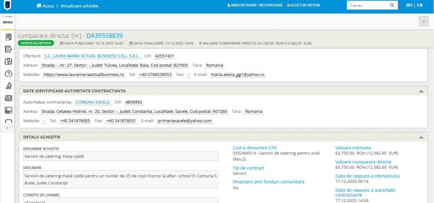Primăria Săcele, județul Constanța, a finalizat o cumpărare directă pentru furnizarea de servicii de catering – masă caldă, destinate copiilor înscriși la programul after-school din localitate. Contractul are o valoare estimată de 63.750 de lei.