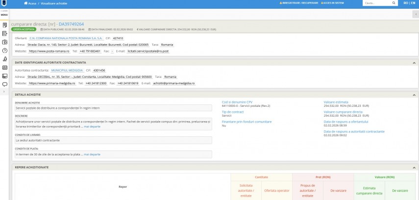 Cumpărări Directe Constanța Primăria Municipiului Medgidia, județul Constanța, contract de aproximativ 255.000 de lei cu CN Poșta Română SA (DOCUMENT)