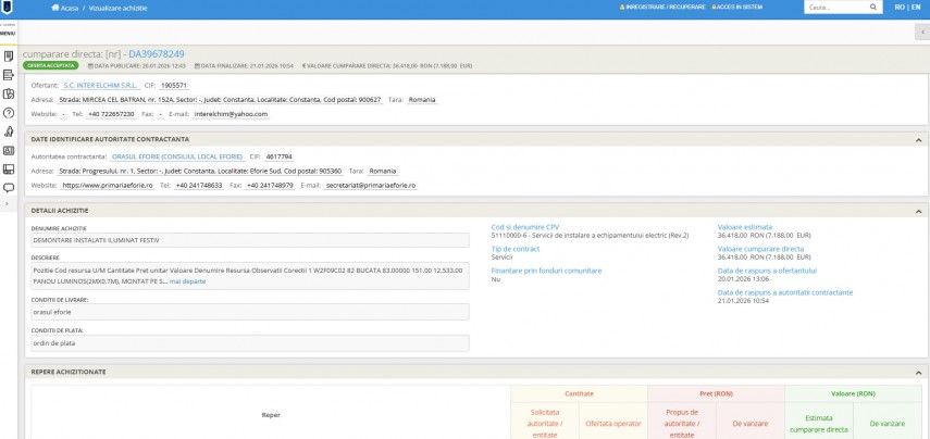 Cumpărări Directe Constanța Primăria Orașului Eforie plătește aproximativ 36.000 de lei pentru demontarea instalațiilor de iluminat festiv (DOCUMENT)