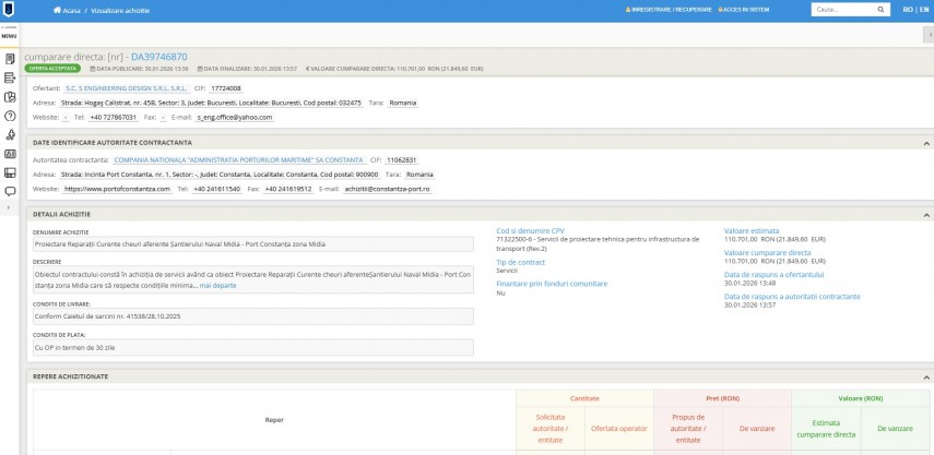 Compania Națională „Administrația Porturilor Maritime“ SA Constanța a atribuit recent prin cumpărare directă un contract de proiectare Reparații Curente cheuri aferente Șantierului Naval Midia - Port Constanta zona Midia.Potrivit LicitatiaPublica.ro, contractul în valoare de 110.701 lei a fost atribuit societății S Engineering Design S.R.L..